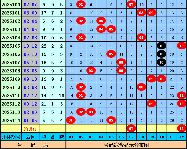 后区奖号分析:上期后区开出奖号01+05,奖号和值为6,跨度为4,本期后区注意和值走大,参考两码07 12。